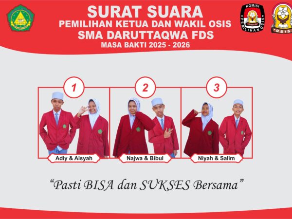 Pemilihan Ketua dan Wakil Ketua OSIS SMA Daruttaqwa FDS tahun 2025 akan segera dilaksanakan pada hari Kamis, 21 Agustus 2025..