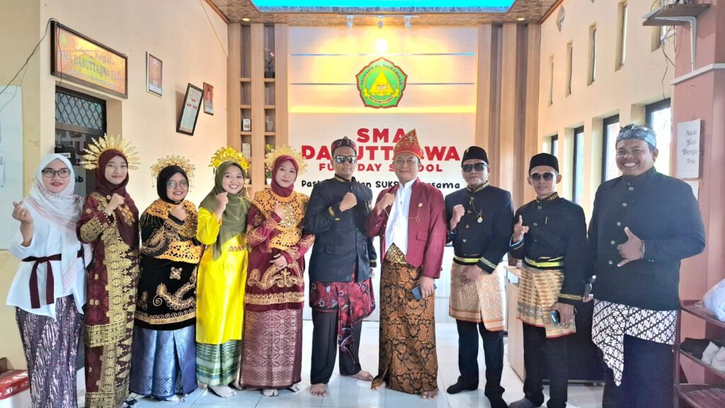 AHAD, 17 AGUSTUS 2025 – Dalam rangka memperingati Hari Ulang Tahun ke-80 Republik Indonesia, SMP & SMA Daruttaqwa FDS menyelenggarakan upacara bendera pada Ahad pagi dengan penuh khidmat di lapangan sekolah. Upacara tahun ini berlangsung istimewa dengan mengusung tema pakaian adat, di mana seluruh dewan guru diwajibkan mengenakan busana tradisional dari berbagai daerah di Nusantara. Kehadiran para guru dengan balutan pakaian adat seperti kebaya Jawa, songket Palembang, dan berbagai macam adat lainnya menambah nuansa semarak sekaligus mempertegas kekayaan budaya Indonesia.